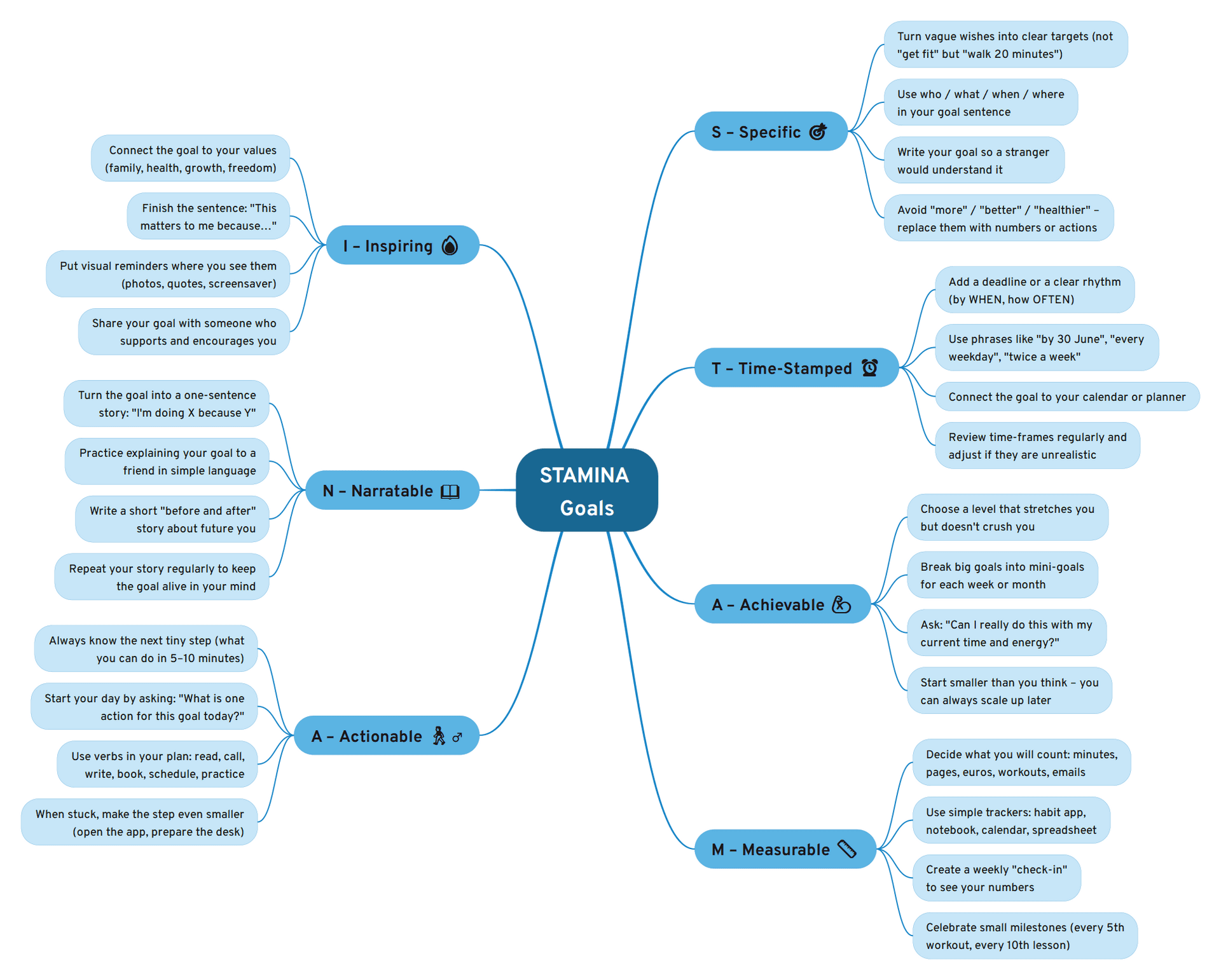Sure. STAMINA is just a way to make goals easier to stick to. Think of it as a checklist. The first one — S for Specific — means you should say exactly what you want. Not “I’ll get healthier,” but “I’ll go for a 20-minute walk every morning.”
